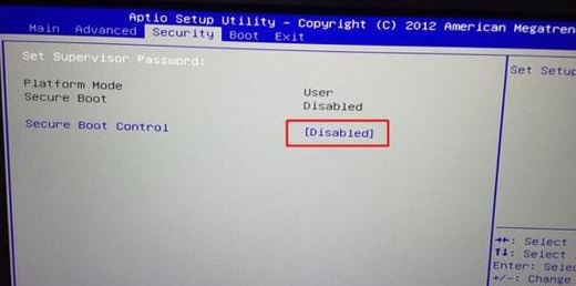 1、重启笔记本按F2进入BIOS设置,在Security下把Secure Boot Control设置为Disabled,如下图所示;
