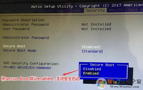 1、重启笔记本按delete进入BIOS设置,在Security下把Secure Boot Control设置为Disabled,关闭"安全启动"如下图所示,然后按F4保存更改重启;