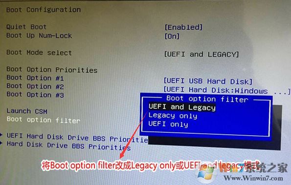 2、重启后再按delete,进入选择Boot选项,将Boot option filer回车设置成legacy only或uefi and legacy,如下图所示;