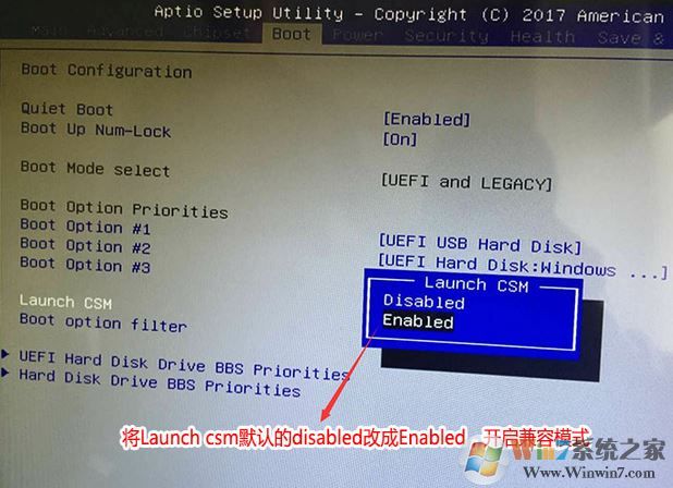 3、再将launch csm设置为Enabled,开启兼容模式,如下图所示,然后再F4保存设置;