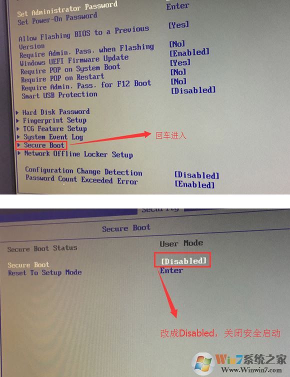 1、开机一直按F2或(FN+F2)进入BIOS,按→方向键切换到Security,选择Secure Boot回车设置成Disabled,如图所示: