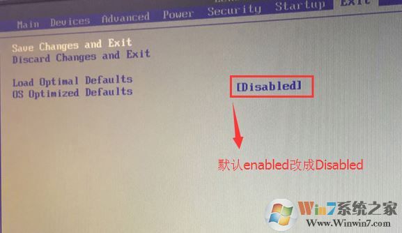 2、转到Exit,把OS Optimized Defaults设置为Disabled,改成支持win7系统模式;