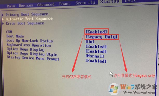 3、切换到Boot,把Boot Mode从UEFI改成Legacy only引导模式,再把csm默认disabled改成enabled,开启兼容模式,选择F10保存设置,在弹出的选项中选择YES;