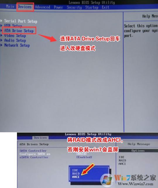 4、将键盘按方向左箭头移动Devices选项,把键盘移动ATA Drive Setup回车,将configure SATA as中默认的raid改成ahci模式,否则安装win7时会出现0x0000007b蓝屏,因为win7中没有集成raid硬盘驱动,然后选择F10保存设置,在弹出的选项中选择YES,如下图所示;