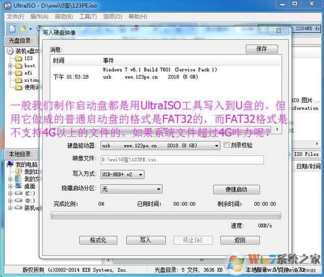 通常情况下,我们下载到系统ISO镜像都可以直接使用UltraISO(软碟通)直接写入到U盘,这样一个系统安装盘就制作好了。用U盘启动就可以安装系统,但是呢,有一个问题,用它制作的启动盘都是Fat32格式的,如果系统ISO镜像里有文件大于4G的话是不能写入到FAT32U盘下的,如果转为NTFS又会不支持启动,这要如何解决呢?