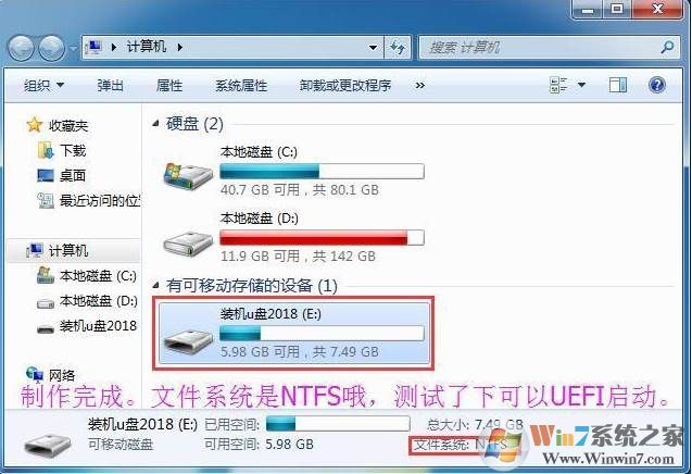 制作完成后,是NTFS格式,我们测试了下,可以UEFI启动。