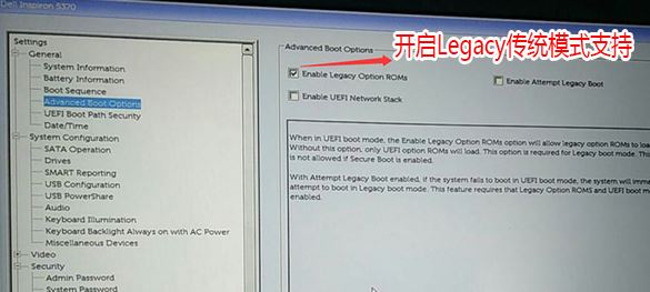 3、切换到Advanced Boot Options将右边的Enable legacy option roms选项打勾,如下图所示;