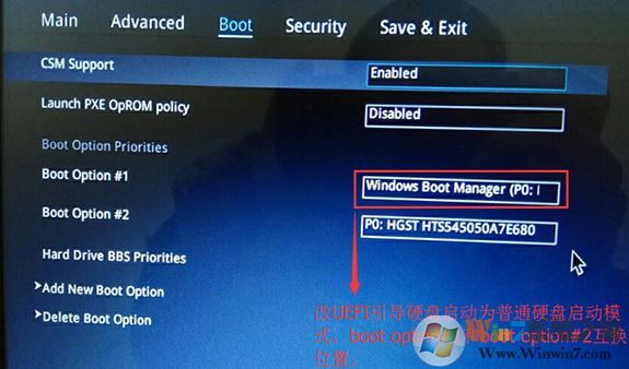 4、继续把boot option#1选项改为普通引导的,boot option#1和boot option#2硬盘启动位置对换,设置第一启动项为普通硬盘引导,带Windwos Boot Manager的为UEFI引导分区,然后按F10保存设置,如图: