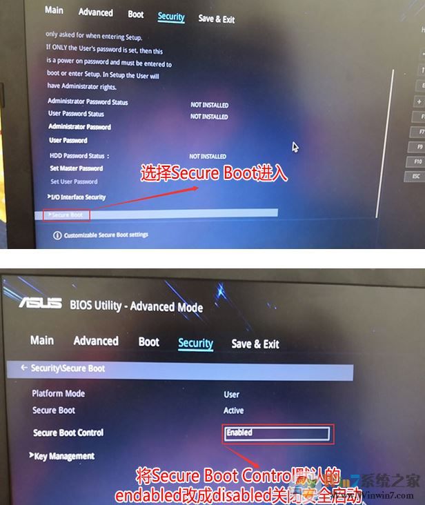2、进入高级模式后,按→方向键移动到Security,选择Secure Boot,然后回车进入把Secure Boot control选enabled改为disabled关闭安全启动,如图: