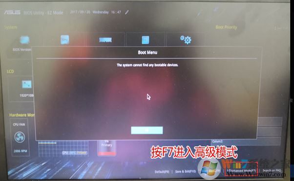 1、重启笔记本按esc进入BIOS设置,然后按F7进入高级模式,如图所示: