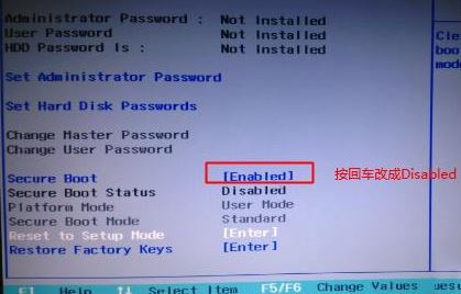 1、开机一直按F2或(FN+F2)进入BIOS,按→方向键切换到Security,选择Secure Boot回车设置成Disabled;