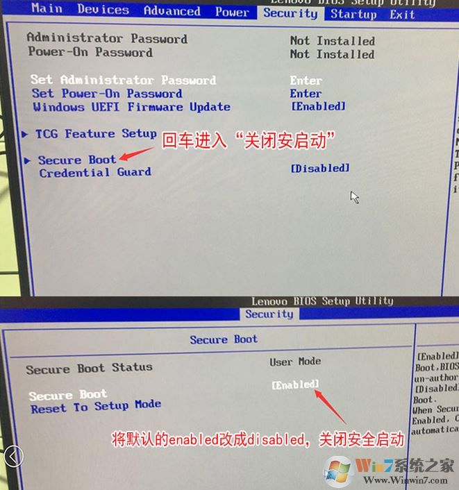 1、开机一直按F2或(FN+F2)进入BIOS,按→方向键切换到Security,选择Secure Boot回车设置成Disabled;