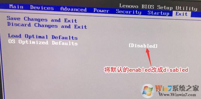 2、转到Exit,把OS Optimized Defaults设置为Disabled;