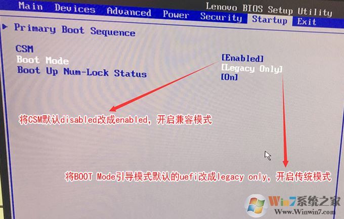 3、切换到Boot,把Boot Mode从UEFI改成Legacy only引导模式,再把csm默认disabled改成enabled,开启兼容模式;