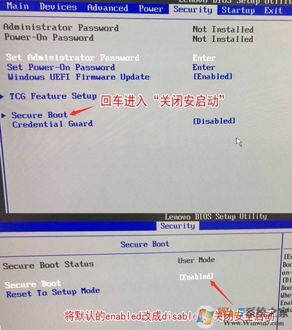 1、开机一直按F2或(FN+F2)进入BIOS,按→方向键切换到Security,选择Secure Boot回车设置成Disabled;