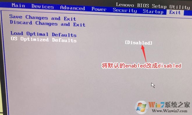 2、转到Exit,把OS Optimized Defaults设置为Disabled;