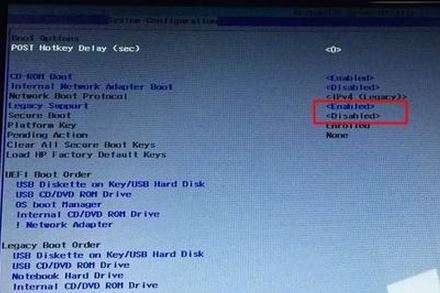 3、进入后把Secure Boot设置成Disabled,再把Legacy Support设置成Enabled,按F10选择Yes回车保存;