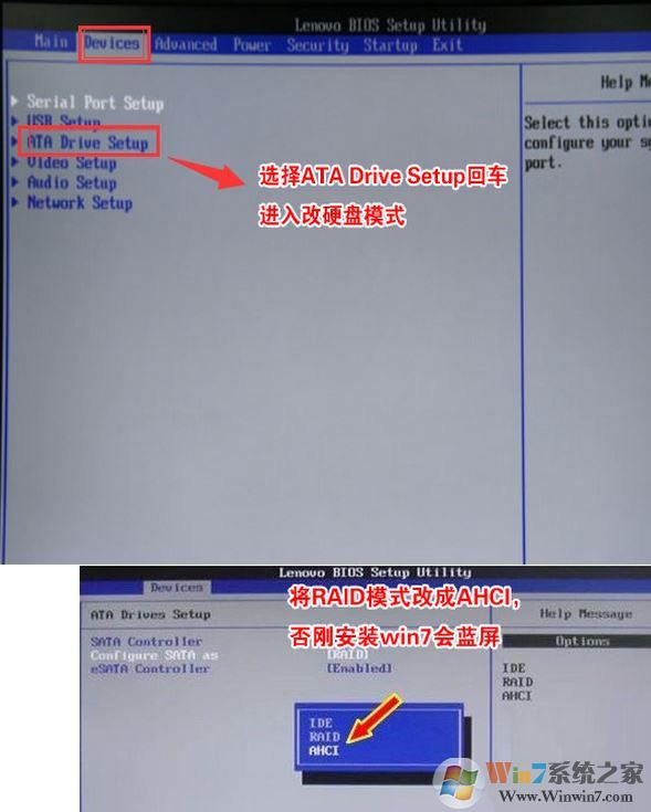 4、切将键盘移动Devices选项,把键盘移动ATA Drive Setup回车,将configure SATA as中默认的raid改成ahci模式,否则安装win7时会出现0x0000007b蓝屏,因为win7中没有集成raid硬盘驱动,然后选择F10保存设置,在弹出的选项中选择YES,如下图所示;