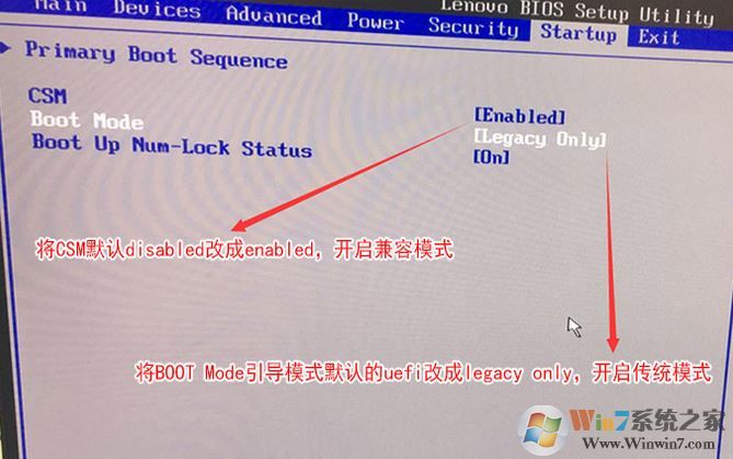 3、切换到Boot,把Boot Mode从UEFI改成Legacy only引导模式,再把csm默认disabled改成enabled,开启兼容模式;