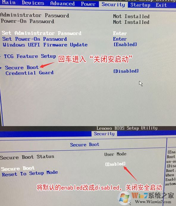 1、开机一直按F2或(FN+F2)进入BIOS,按→方向键切换到Security,选择Secure Boot回车设置成Disabled;