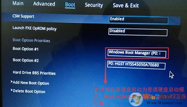 4、继续把boot option#1选项改为普通引导的,boot option#1和boot option#2硬盘启动位置对换,设置第一启动项为普通硬盘引导,带Windwos Boot Manager的为UEFI引导分区,然后按F10保存设置;