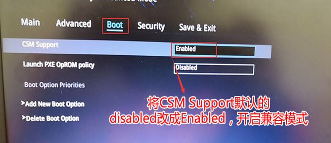3、再切换到BOOT的选项,把CSM support由disabled改成enabled,开启兼容模式,;