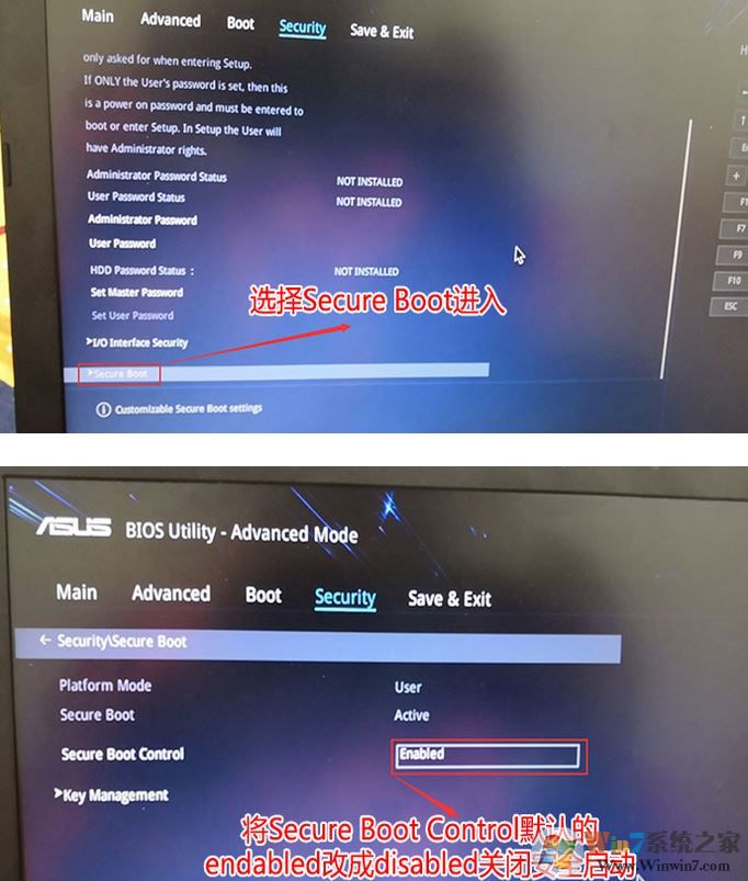 2、进入高级模式后,按→方向键移动到Security,选择Secure Boot,然后回车进入把Secure Boot control选enabled改为disabled关闭安全启动;