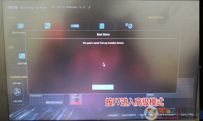 1、重启笔记本按esc进入BIOS设置,然后按F7进入高级模式,如下图所示;