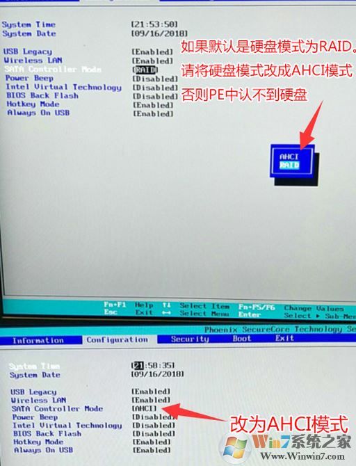 6、注意:如果默认硬盘模式为RAID,请将硬盘模式改为AHCI模式,否则进PE后不能认出硬盘,如下图所示;