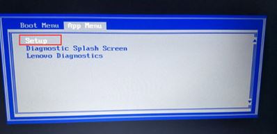 1、重启笔记本按F12,按TAB键切换栏目到"App Menu",然后选择"setup"进入BIOS设置,或是看到lenovo或ThinkPad标识后多次按Enter回车,听到报警声后等待下一画面,然后按F1或Fn+ F1进入BIOS主界面。如下图所示;
