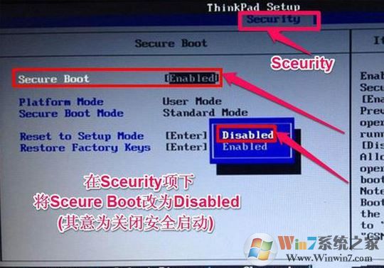 2、按→方向键移动到Security,将secure boot改成disabled,关闭安全启动,如下图所示;