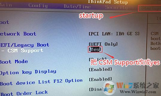 3、选择startup,把csm support,设置为Yes(开启兼容模式)。