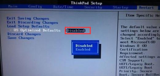 4、在Restart下,选择OS Optimized Defaults回车,改成Disabled或Other OS,接着选择Load Setup Defaults回车进行加载,然后按F10保存设置。