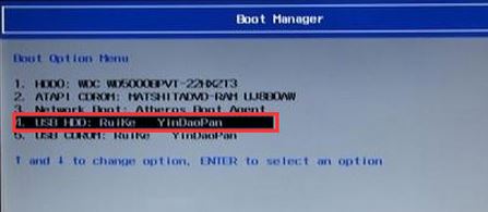 5、插入U盘启动盘,重启时不停的按下f12,打开Boot Manager,选择USB HDD回车从U盘启动,如下图所示;