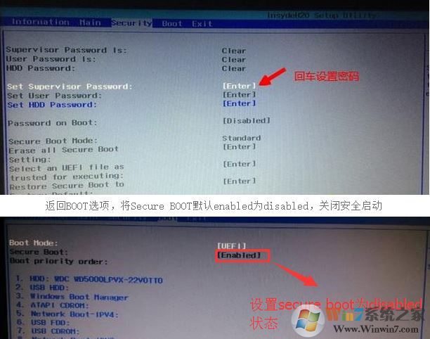 2、如果Secure Boot灰色无法设置,则转到Security,选择Set Supervisor Password回车设置密码,再返回BOOT选项,将Secure BOOT默认enabled为disabled,(注:改完secure boot后再设置密码为空即可,要不每次进BIOS都要设置)如下图所示;