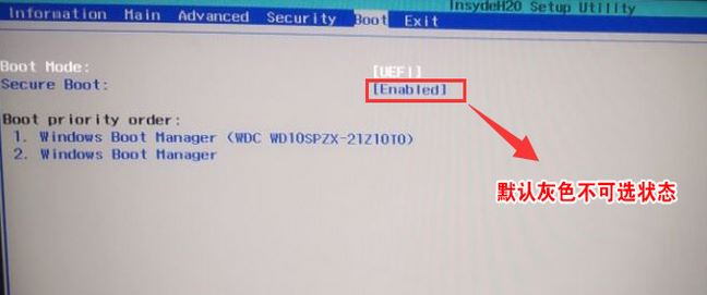 1、开机一直按F2进入BIOS,按F2进入BIOS界面,首先我们要关闭安全启动(secure boot选项默认为enabled),切换BOOT项后发现secure boot灰色不可选状态,如下图所示;