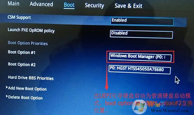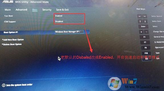2、重启后切换到BOOT的选项,分别把fast boot和csm support由disabled改成enabled,分别开启快速启动和兼容模式;