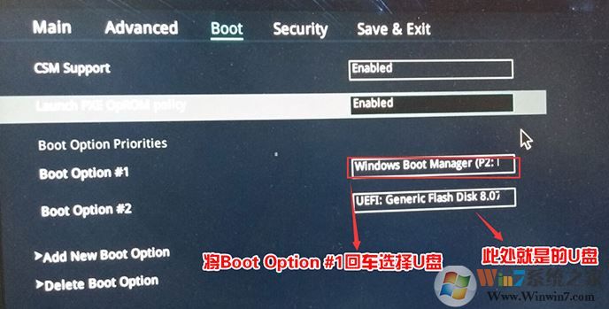 4、继续把boot option#1选项改为U盘为第一启动项,设置为U盘启动,如下图所示;