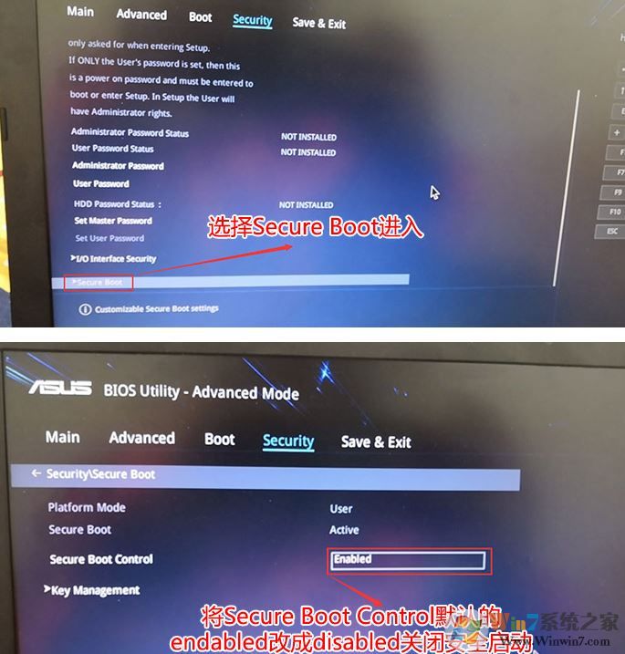 2、进入高级模式后,按→方向键移动到Security,选择Secure Boot,然后回车进入把Secure Boot control选enabled改为disabled关闭安全启动,然后按F10保存重启;
