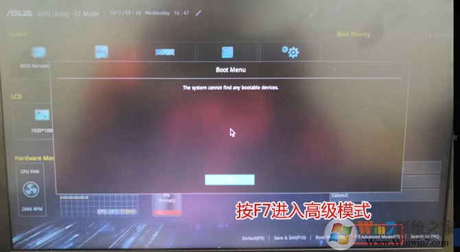 1、重启笔记本按esc进入BIOS设置,然后按F7进入高级模式,如下图所示;