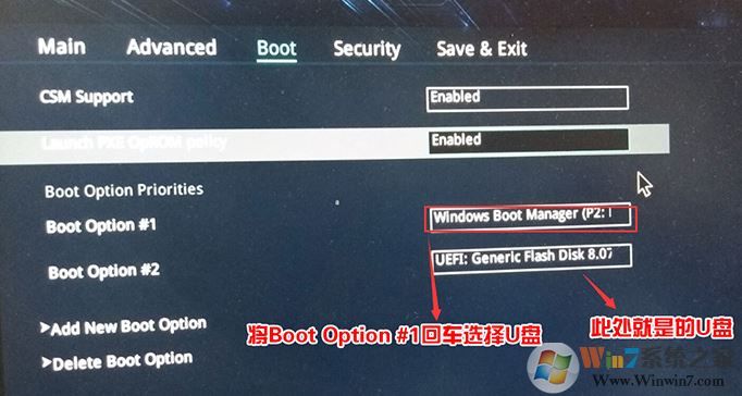 4、继续把boot option#1选项改为U盘为第一启动项,设置为U盘启动,如下图所示;