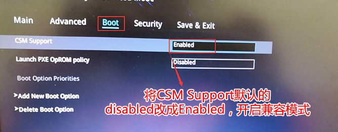 3、重启后切换到BOOT的选项,分别把fast boot和csm support由disabled改成enabled,分别开启快速启动和兼容模式;