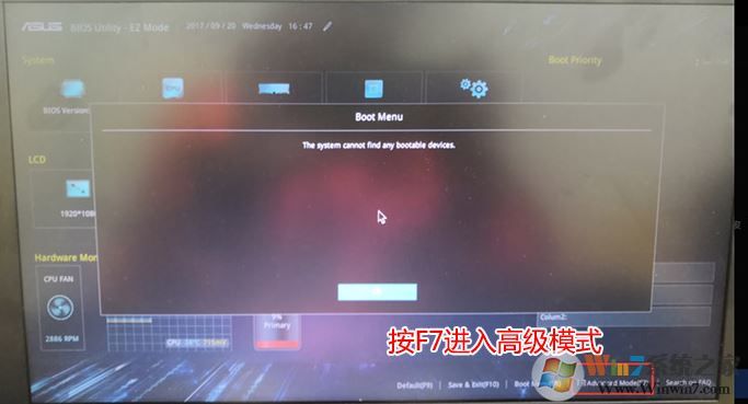 1、重启笔记本按esc进入BIOS设置,然后按F7(或者点击右下角 从右往左数第二个选项)进入高级模式,如下图所示;