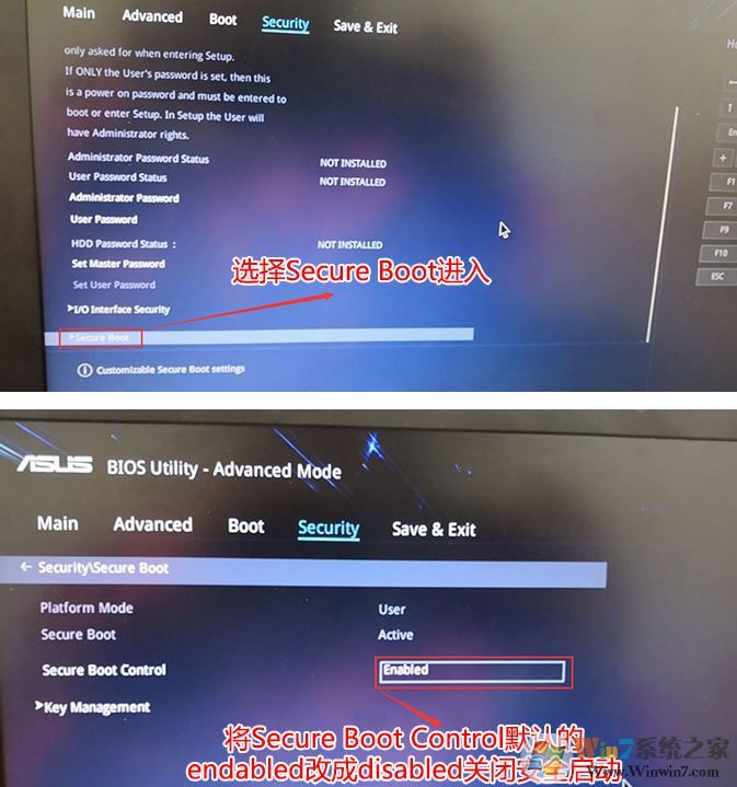 2、进入高级模式后,按→方向键移动到Security,选择Secure Boot,然后回车进入把Secure Boot control选enabled改为disabled关闭安全启动,然后按F10保存重启;