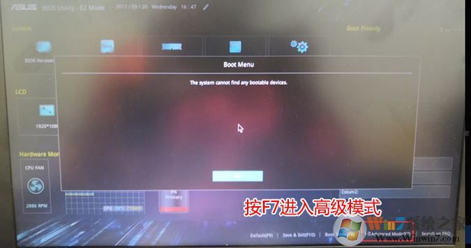1、重启笔记本按esc进入BIOS设置,然后按F7进入高级模式,如下图所示;