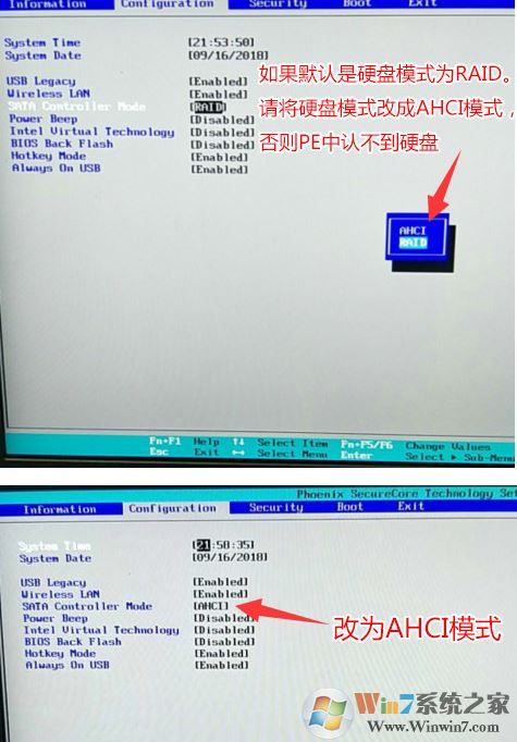 6、注意:再返回configuration这项,查看sata controller mode这项,如果默认硬盘模式为RAID,请将硬盘模式改为AHCI模式,否则进PE后不能认出硬盘,如果更改后记得按F10保存,如下图所示;
