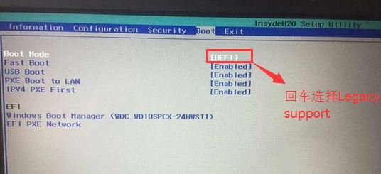 4、切换到Boot,把Boot Mode从UEFI改成Legacy Support,改传统引导,如下图所示;