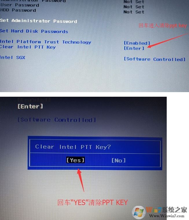 注:按如果Security选项下没有Secure Boot选项,看下是否有"clear intel PTT Key"选项,如果有进入回车选选择“yes”清除ppt key,否则无法安装系统后无法引导启动,如下图所示;