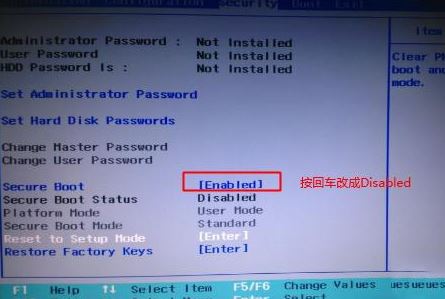 1、开机一直按F2或(FN+F2)进入BIOS,按→方向键切换到Security,选择Secure Boot回车设置成Disabled,关闭安全启动,否则安装win7会失败,如下图所示;