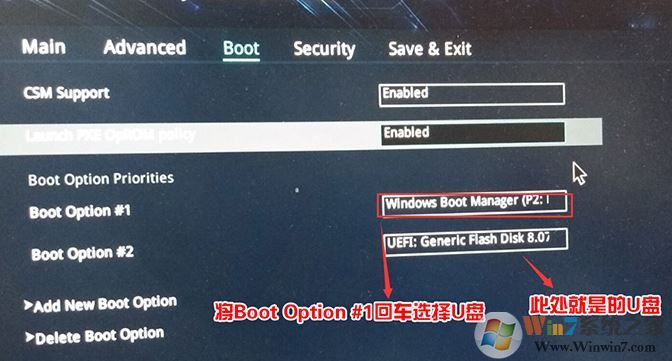 4、继续把boot option#1选项改为U盘为第一启动项,设置为U盘启动,如下图所示;